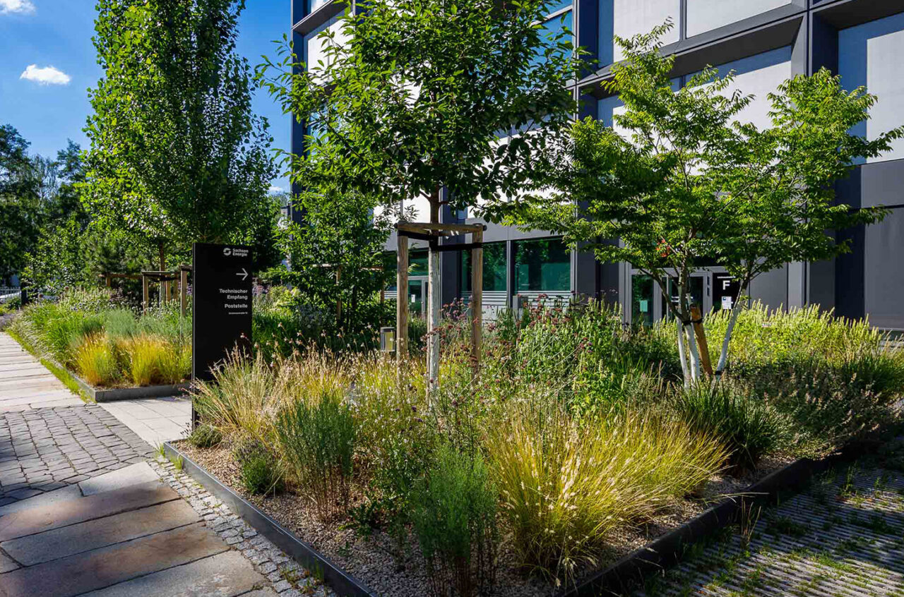 Für den Neubau der SachsenEnergie AG am Hauptbahnhof Dresden wurde ein grüner Rahmen als Pufferzone entwickelt. Hochbeete mit Gräsern, Sträuchern, Gehölzen und vereinzelte Sitzgelegenheiten schaffen Aufenthaltsqualität. Sie dienen als qualitätsvolle Abstandsfläche und Sichtschutz zu den öffentlichen Wegen und Privatgrundstücken.